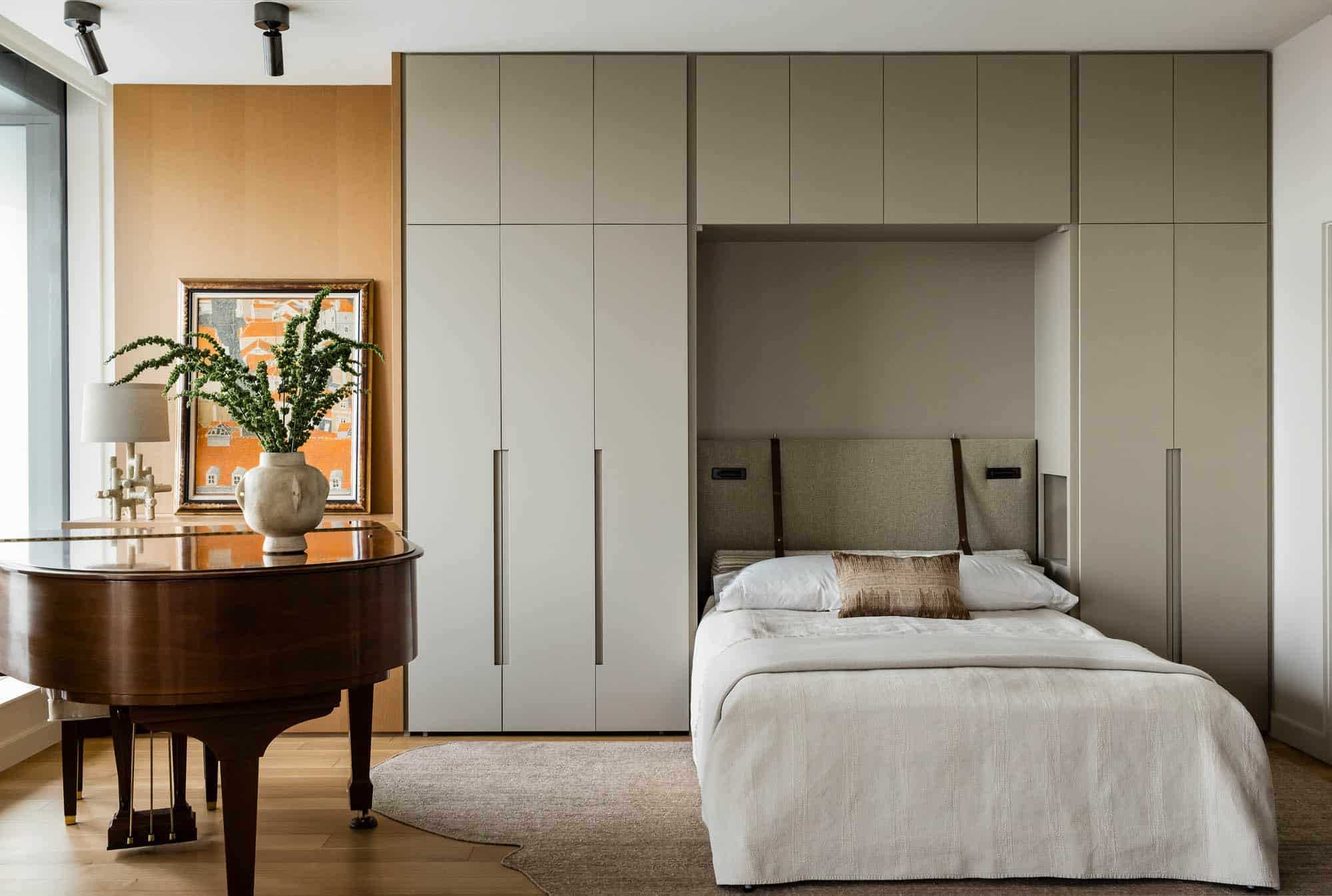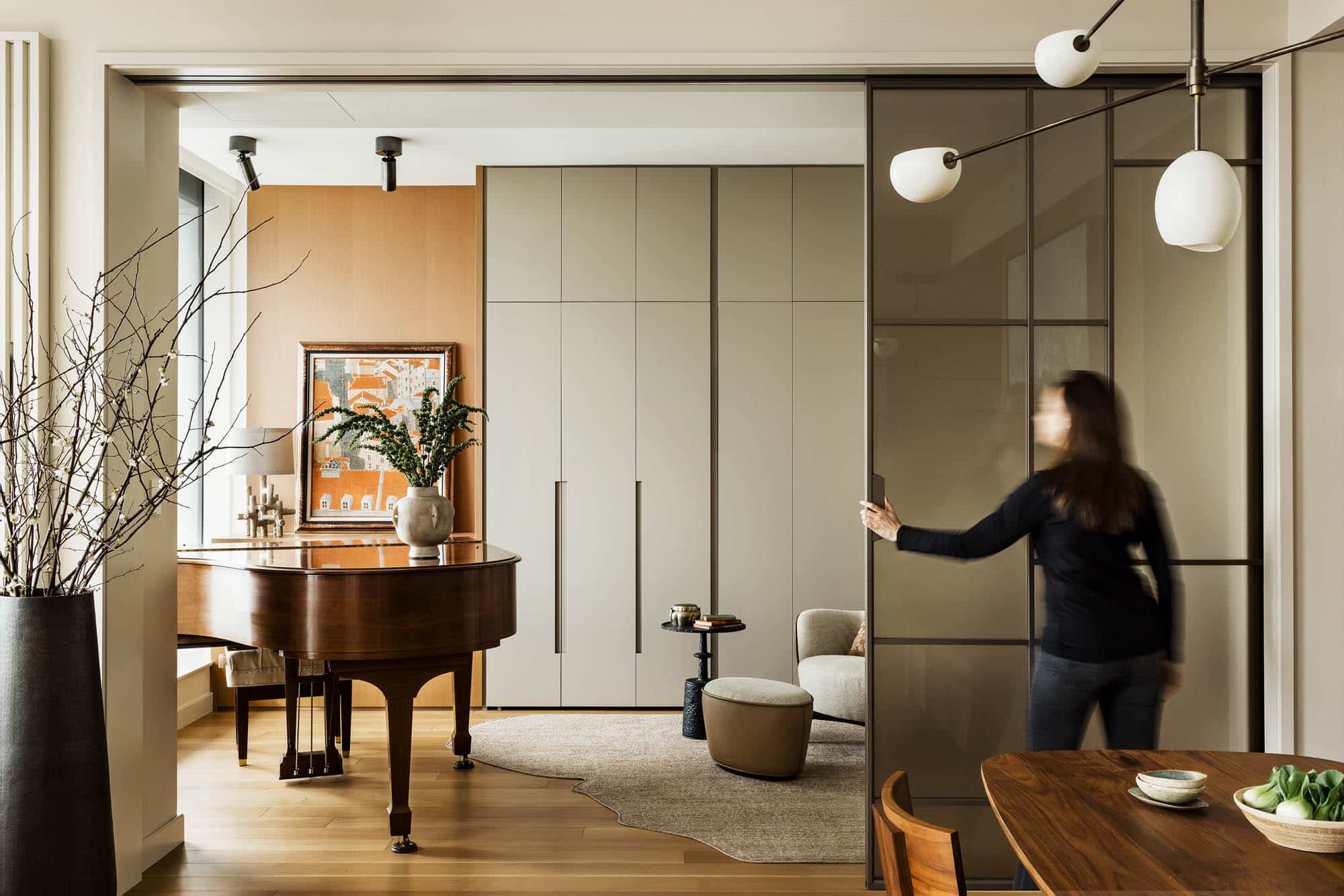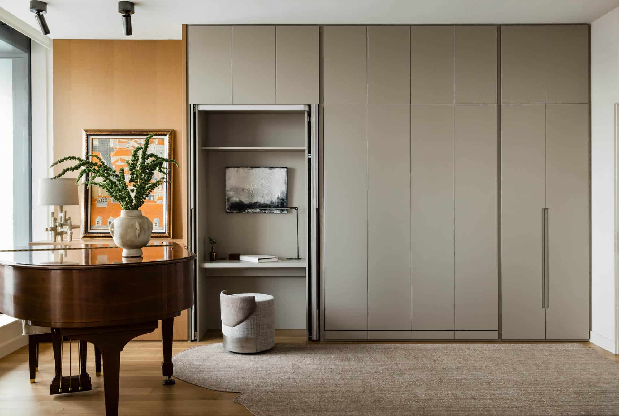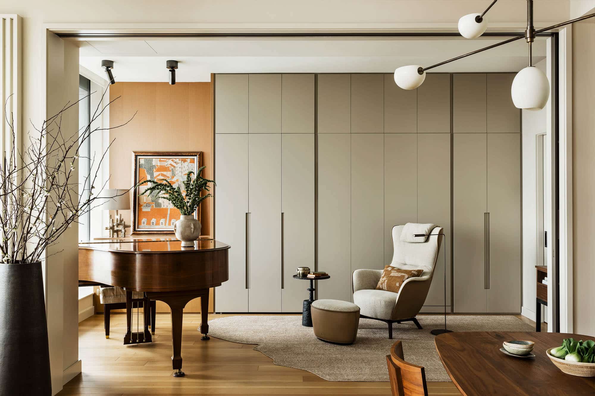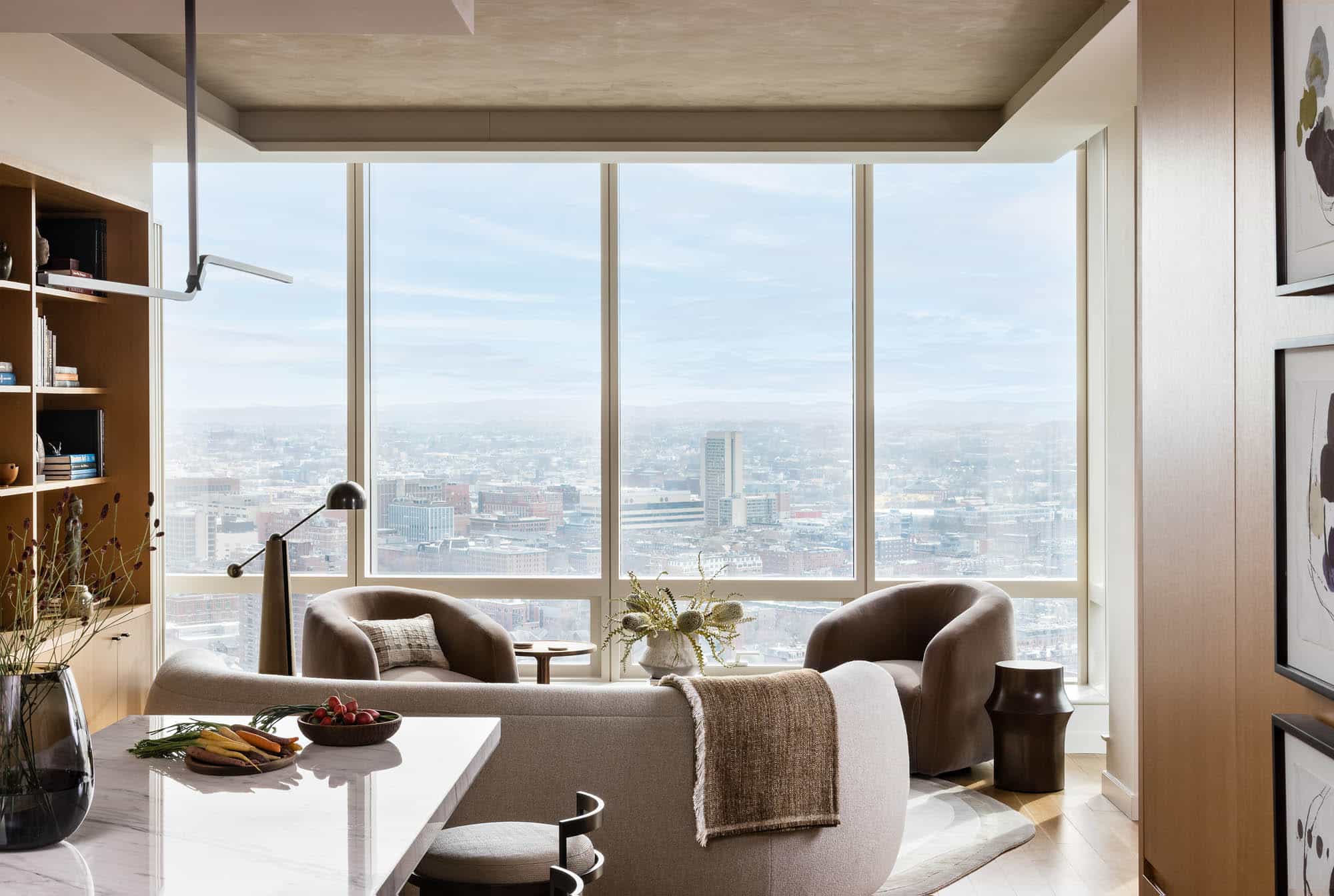 Hacin’s Back Bay Pied-à-Terre project was completed for an empty-nester couple seeking a global-inspired, welcoming home base after relocating from a large family home in the Boston suburbs. The couple, seasoned travelers who have lived abroad in various countries, wanted their new home to reflect their international experiences while embracing the simplicity and convenience of residential tower living. Located in the Raffles Boston residences, the project engaged an interdisciplinary architecture and interiors team to reconfigure the existing floor plan and add new finishes, millwork, lighting, and furniture. The concept aimed for a calming, neutral palette, featuring clean lines and accents of contemporary lighting, softened by textural details and sculptural forms.
