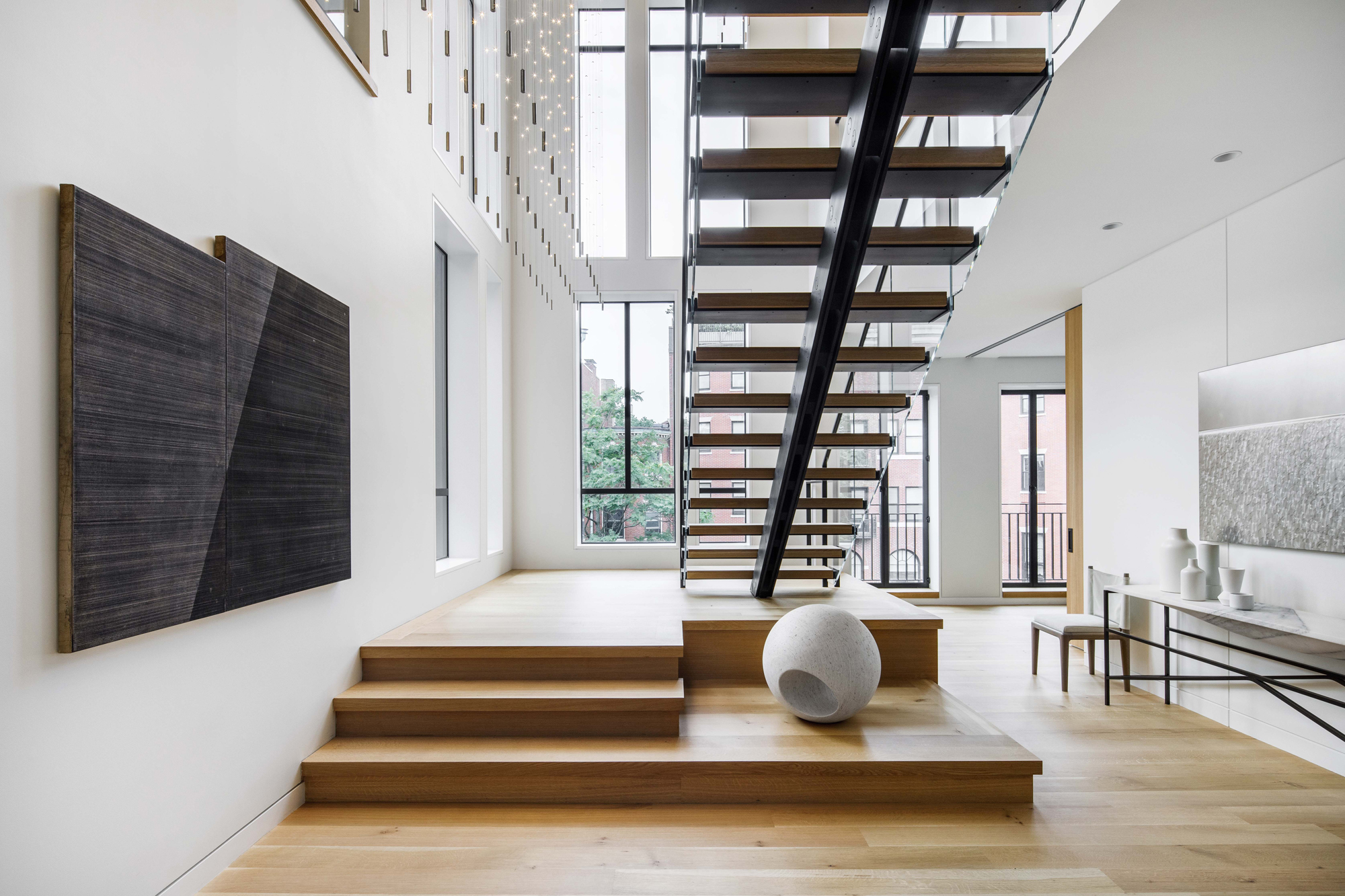 Four51 Penthouse was conceived as a ‘home base’ for a couple and their extended family. The design team faced the challenge of incorporating the clients’ desire for a clean, minimal space into the historic context of the Back Bay. The subsequent residence was borne from a curated selection of natural, carefully-crafted elements that work together to create a modern identity amidst the tradition and formality of its surroundings. The project’s concept is a celebration of American industrial design and supports the work of emerging artists and craftspeople. This focus inspired the use of unassuming, organic materials and layered, natural textures, such as woven paper carpets and clay walls. A level of humility exists in the forms throughout the penthouse, honoring the client’s wish for a timeless, meditative space. Unique metalwork, such as the custom-built stair, celebrates the client’s background in developing innovative technology for detailed metal fabrication. Similarly, black steel windows punctuate the home’s street view, framing Boston’s characteristic red brickwork. Outside, the penthouse includes multiple terraces with 360-degree views.